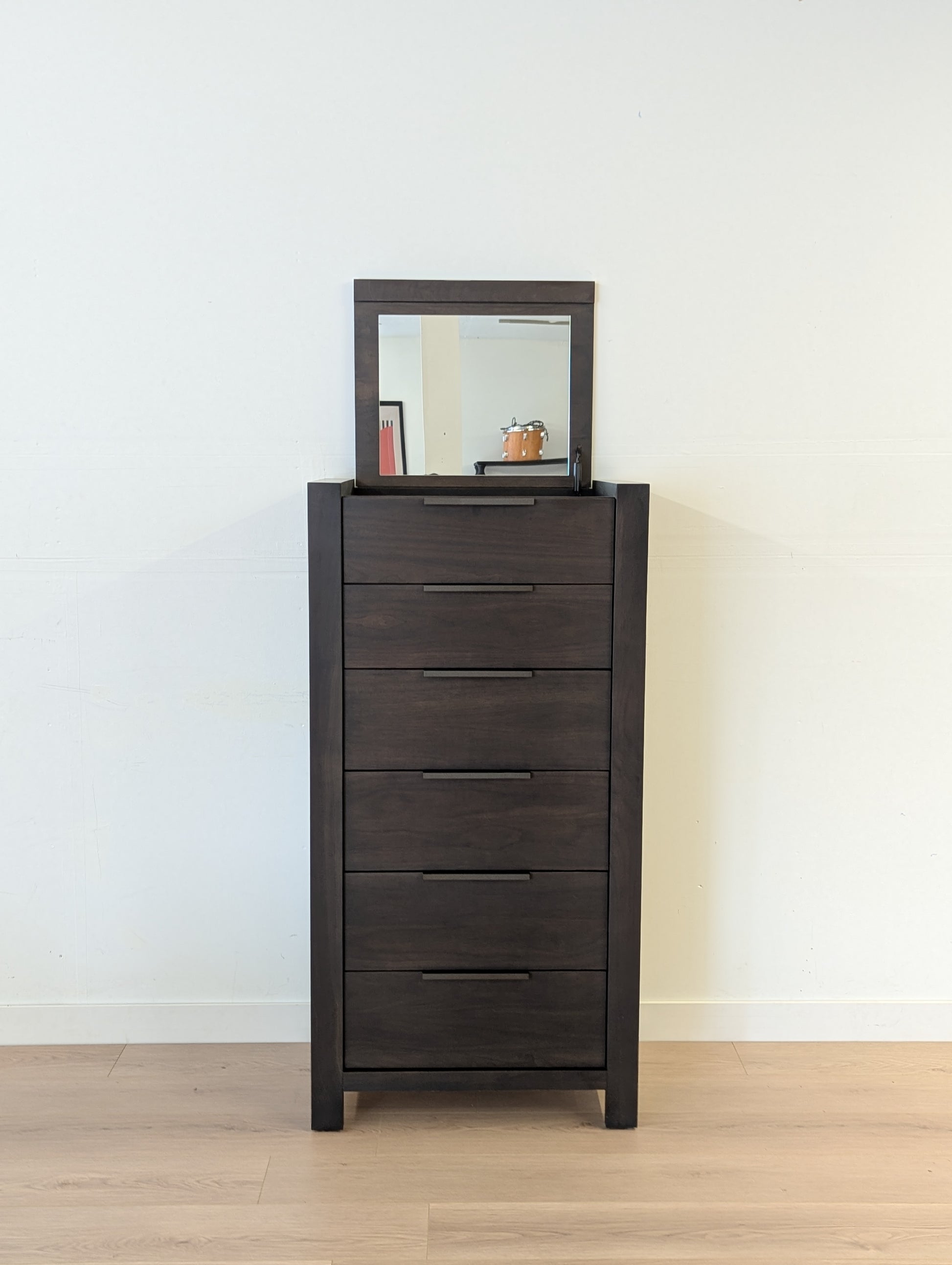 Description: Top two drawers: 5.5" high x 16" deep Bottom four drawers: 7" high x 16" deep This dresser also features a lift-up mirror (18" x 14.5") above a hidden 3" deep compartment, ideal for jewelry and small items.
